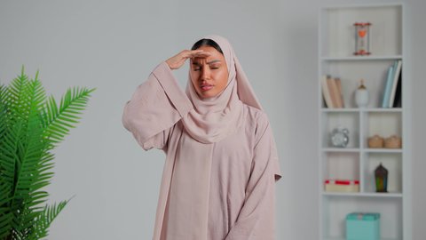 Attention to elegance and external appearance, illustrations of a smiling, veiled Saudi Gulf Arab woman looking at the camera with gestures of pleasure, white background