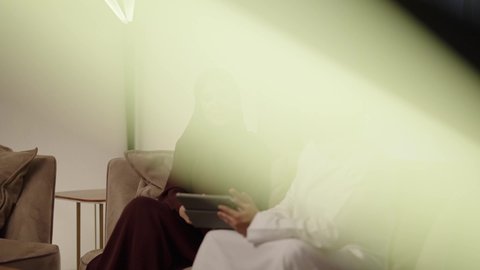 Enjoying the happy family atmosphere during the holidays, discussions and dialogues between parents and children, an Arab Gulf Saudi father wearing a white thobe sitting in the living room exchanging conversations with his daughter, the concept of the interconnected Saudi family, building strong family relationships.