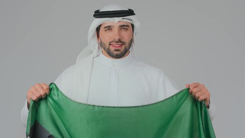The symbol and banner of national identity, the word of monotheism and Islam, there is no god but God, the flag of the Kingdom of Saudi Arabia fluttering in the sky of the city of Diriyah in Riyadh at night time, the celebration of the anniversary of the