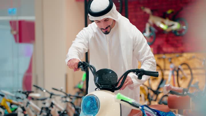 Buying medicines and medical drugs, an Arab Gulf Emirati man wearing a white ghutra and kandura searches inside the pharmacy and selects some supplies, reading the necessary instructions and guidelines before use, ordering the medicines included in the prescription, checking the expiration date