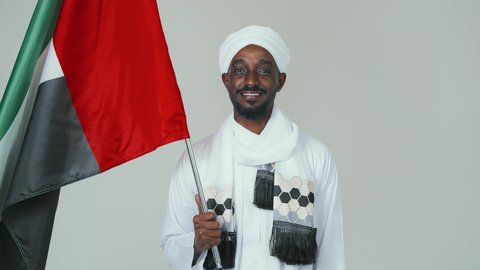 Expressions and gestures of pride and joy, celebrating independence on January 1, commemorating Sudan's National Day in 1956, love for the homeland and pride in it, a side portrait of a Sudanese Arab man wearing a jalabiya, shawl, and white turban, draping the Sudanese flag over his shoulders, with a white background.